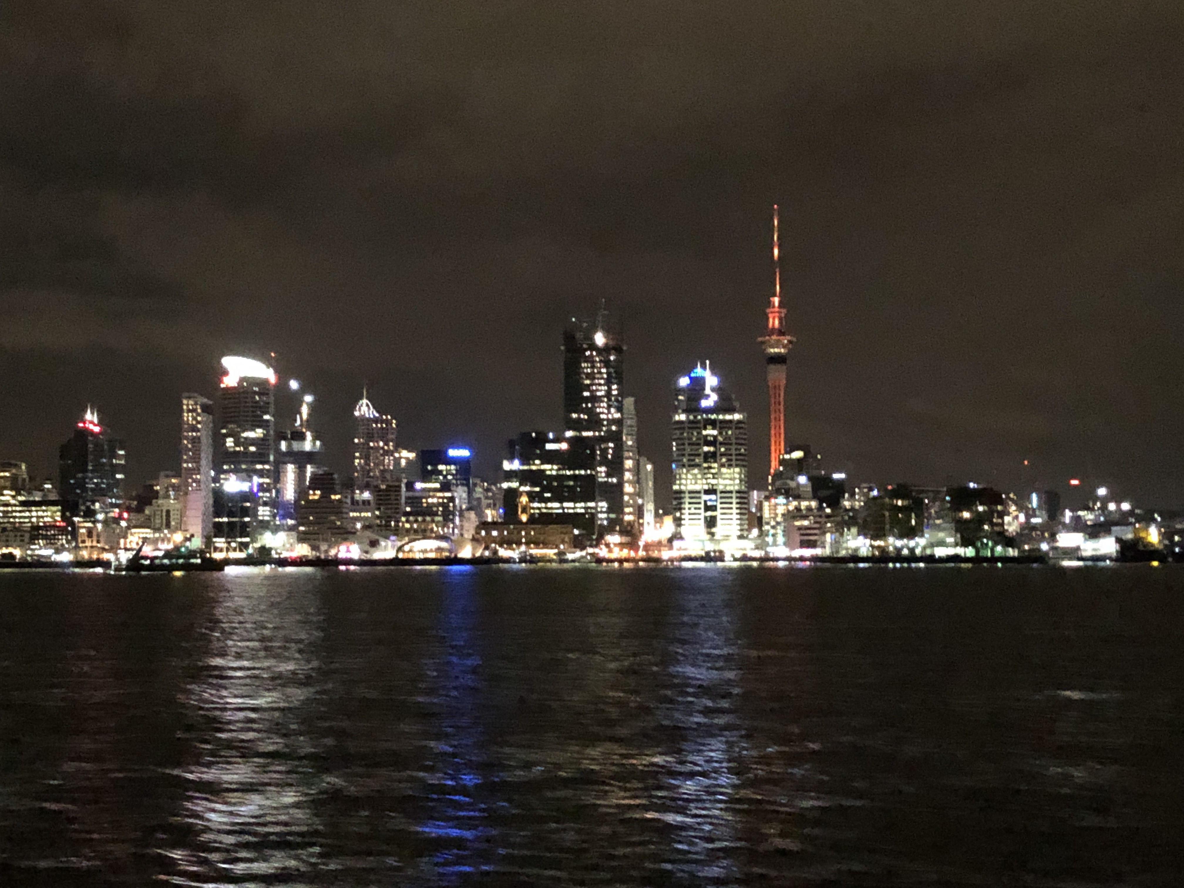 We set out from Orakei Marina and headed out into the Waitemata Harbour. The evening was cold and luckily we had been warned to come prepared. So I did with thermals, a hat, gloves, scarf and a waterproof jacket. On the way the sun went down and the sails were hoisted. We sailed past Auckland Business district to a beautiful display of fireworks for Bastille Day. The sun dipped lower and lower and with it the changing evening colours reflected in the clouds. Eventually we were in darkness and the city lights reflected on the water.