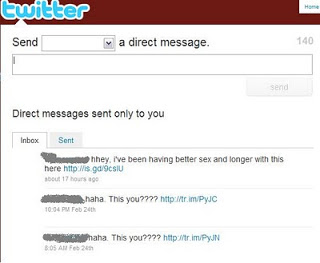 To find out what was going on I searched Twitter virus, February, 2010. Phishing came up. Something else came up too, called Direct Messaging. That is the first image on this blog.