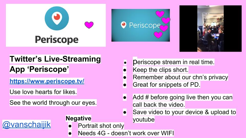 I shared about a twitter app called Periscope that has the facility to live stream. I have added a summary to my slide and embedded the short demonstration clip I took during Fiona Grant’s introduction.