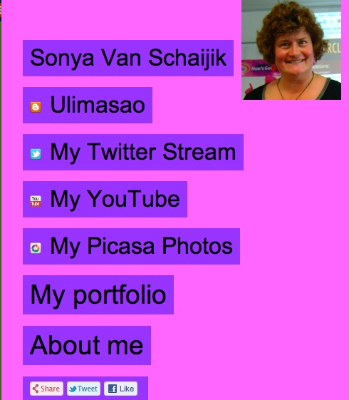 I place this link onto twitter. Initially, I added my personal youtube video space and picassa photo folders. However when I was checking out information, I realized that the sites chosen did not match my twitter persona. So I adapted and merged my teacher sites with my personal blog. Even that does not feel correct as I have been channeling our teachers learning onto our school youtube account. A few of the videos are not ones I have created.